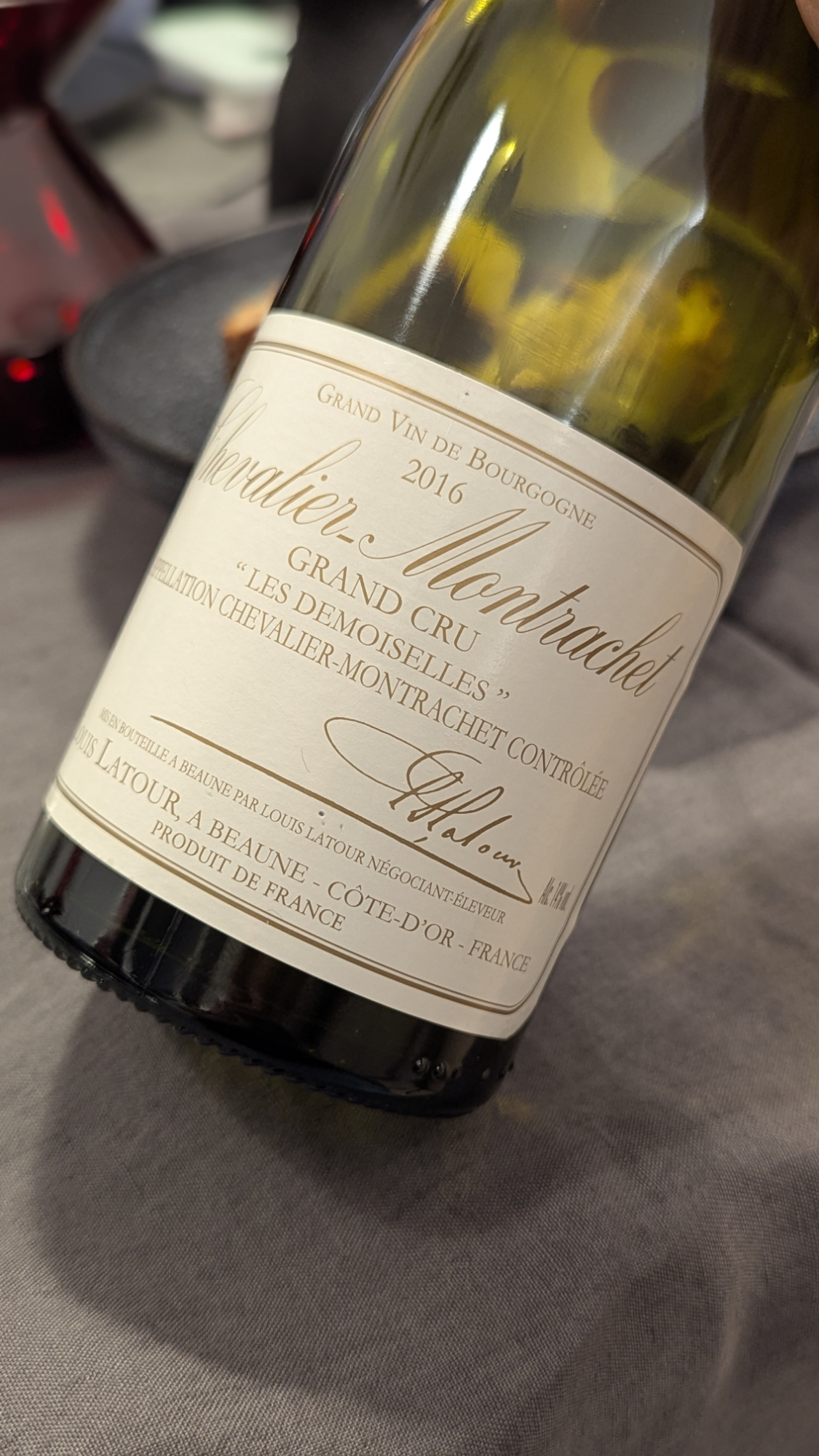 Es folgte ein 2016er Chevalier-Montrachet „Les Demoiselles“ von Louis Latour. Den Auftakt bilden Noten von Veilchen und Maiglöckchen, Propolis, Steinobst und ein wenig Holz. Am Gaumen ist der Wein hochelegant, duftig und schwebend, aber tatsächlich ein bisschen zu leichtgewichtig für einen Grand Cru. Er wirkt saftig, etwas zu rund und warm. Ein sehr schöner Wein, leider mit etwas Mangel an Präzision. Es war der, den ich mitgebracht hatte.